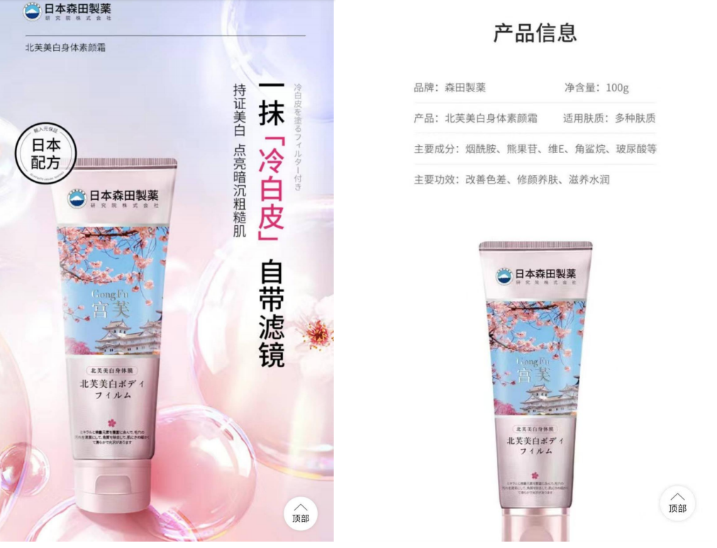 事情的起因可以追溯到2021年。当时,森田品牌方发现拼多多平台上的一家名为“宫芙旗舰店”的店铺,正在销售一款名为“北芙美白身体膜”的侵权产品。经过公证人员的调查,森田方发现,该店铺的商品页面上使用了“日本森田制药”等字样,甚至在商品详情中声称“店铺产品均有日本森田制药正品授权”,企图让消费者相信这是森田品牌的正品。